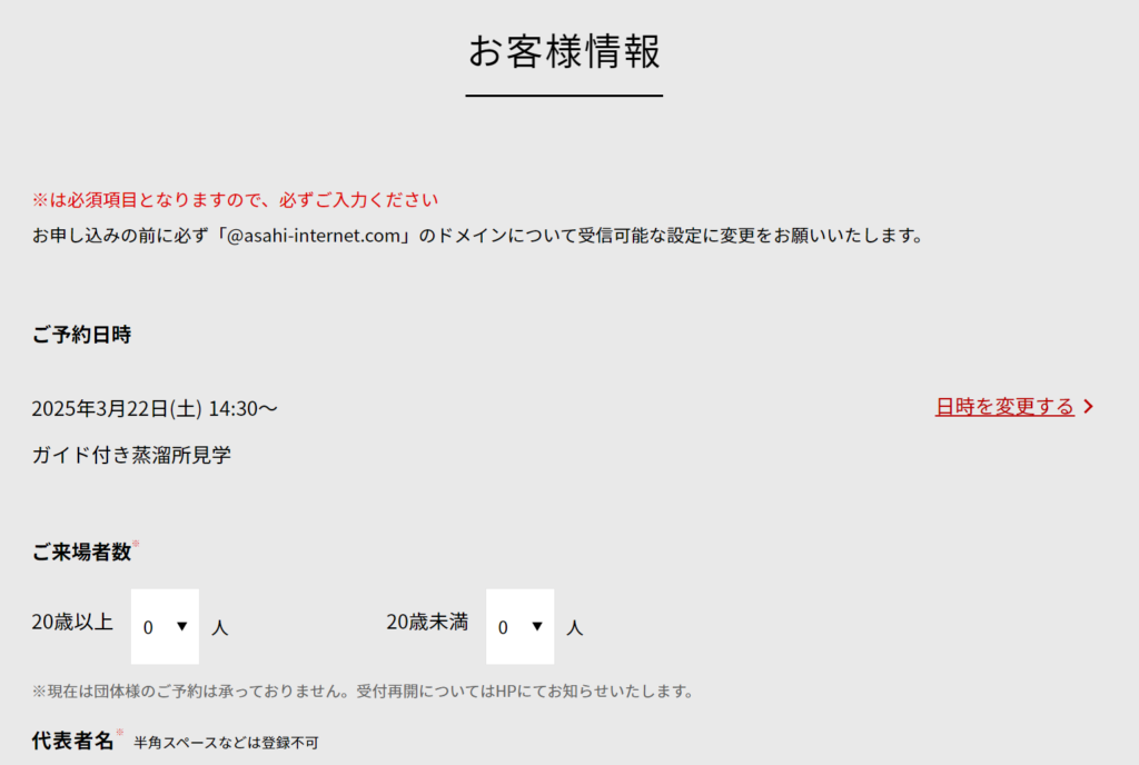 | 条件 | 見学希望の1~9名は前日までに事前予約1名様~9名様(20歳未満、乳児含む) |