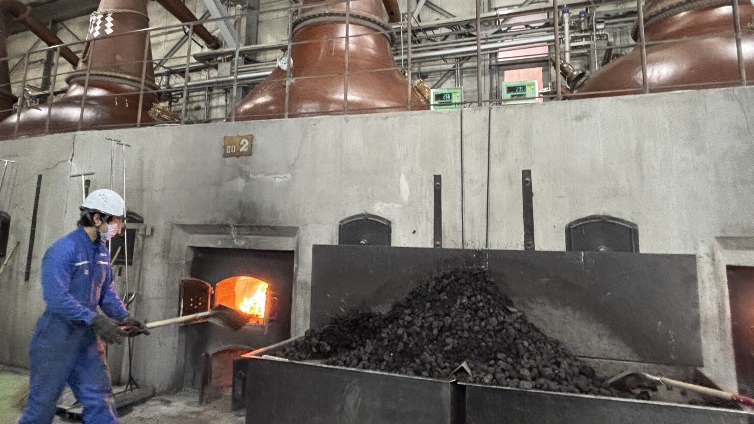 もろみをポットスチルと呼ばれる単式蒸溜機で2回蒸溜します。ここで、伝統的な石炭直火蒸溜により、力強く重厚なモルトウイスキーがつくられます。